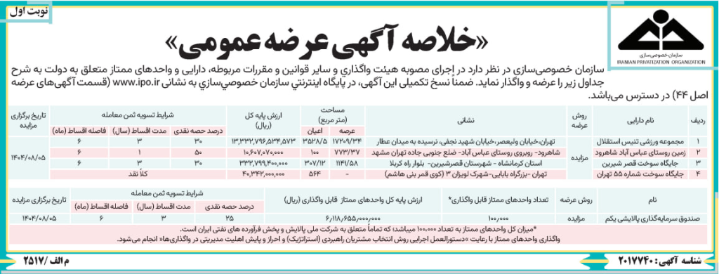 سازمان خصوصی سازی در تازه ترین اطلاعیه خود، فهرست مزایده جدیدی از دارایی های دولتی شامل چند ملک و صندوق سرمایه گذاری را اعلام کرد.