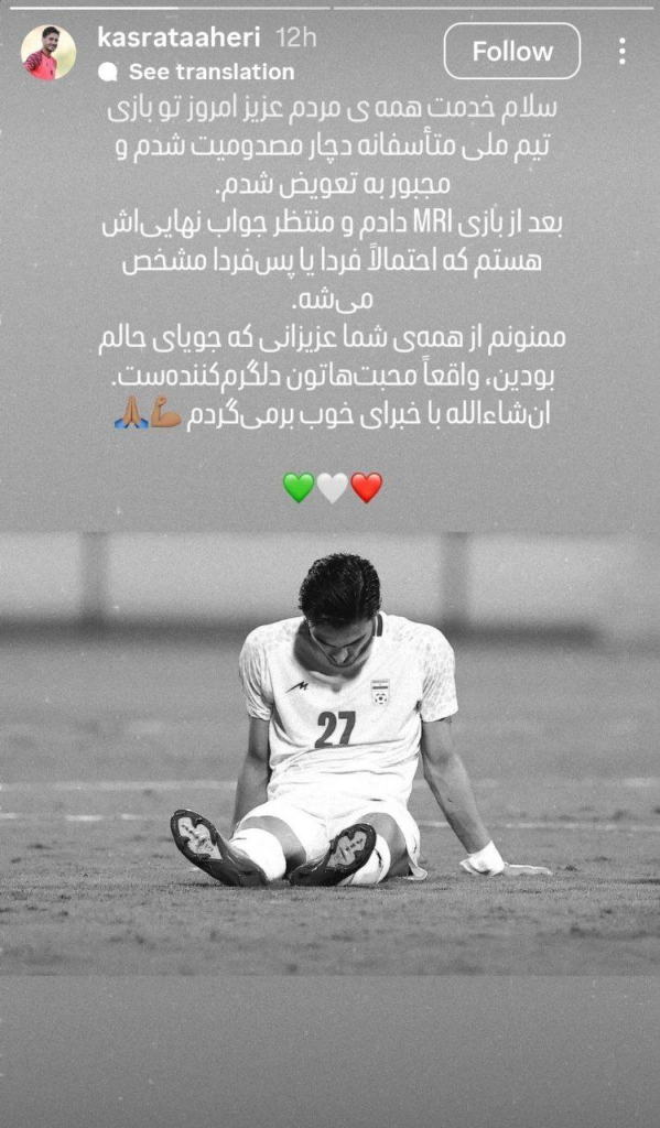 کسری طاهری، مهاجم ملیپوش تیم ملی ایران، در جریان دیدار مقابل تانزانیا مصدوم شد و با انتشار پیامی از هواداران بابت پیگیری وضعیتش قدردانی کرد.