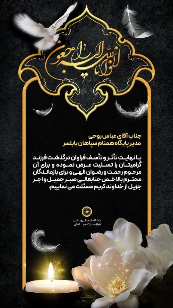 باشگاه سپاهان در پی درگذشت ابوالفضل روحی، دروازهبان جوان بابلسر و فرزند عباس روحی، مدیر پایگاه این باشگاه در شمال کشور، پیام تسلیتی منتشر کرد.