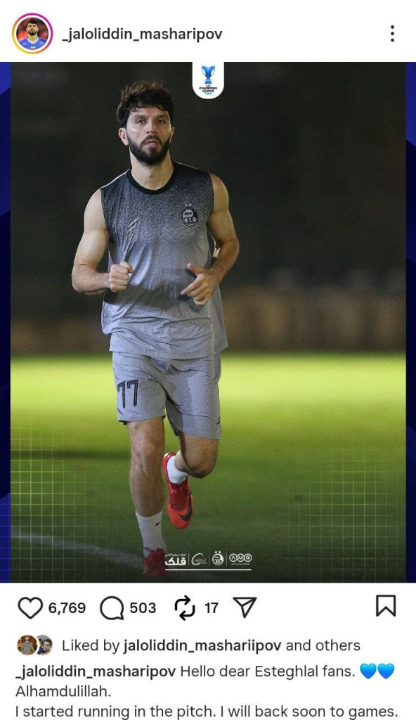 ماشاریپوف در این پیام خطاب به هواداران استقلال نوشت: دویدن در زمین را شروع کردهام، به زودی برمیگردم.
