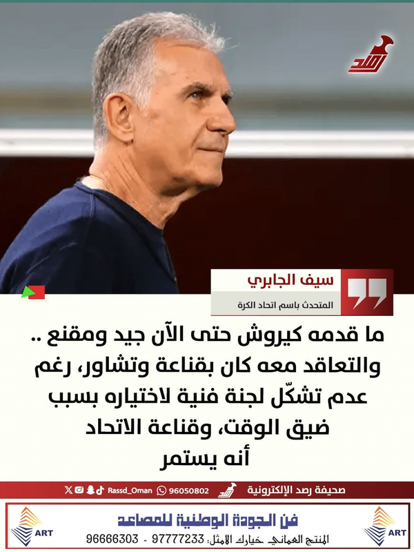 سیف الجابری، سخنگوی فدراسیون فوتبال عمان، اعلام کرد «آنچه کیروش تاکنون ارائه کرده، قابل قبول و رضایتبخش است». گزارشها نشان میدهد مسئولان فدراسیون از جنگندگی بازیکنان عمان در مقابل قطر و امارات راضی هستند و چراغ سبز برای ادامه همکاری با کیروش روشن شده است.