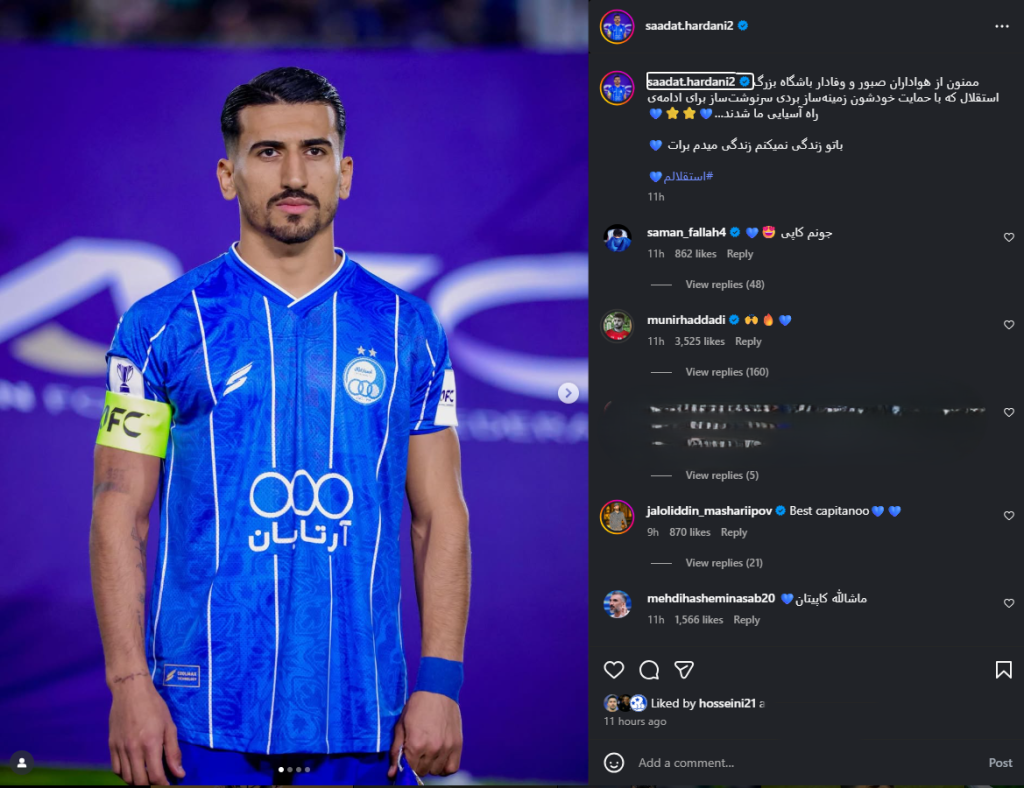صالح حردانی با انتشار پستی از هواداران استقلال تشکر کرد.