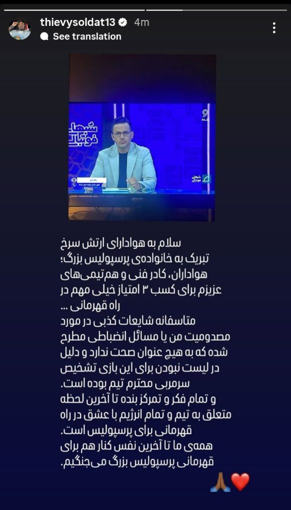 تیوی بیفوما، وینگر پرسپولیس، با انتشار استوری اعلام کرد که غیبتش در دیدار مقابل ذوبآهن به تصمیم کادر فنی بوده و هیچ مشکل انضباطی یا مصدومیت نداشته است.