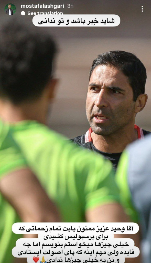 به گزارش هفت ورزشی، پس از جدایی ناگهانی وحید هاشمیان از نیمکت پرسپولیس، فضای مجازی سرخپوشان مملو از واکنشهای گوناگون شد. در این میان، مصطفی لشگری، چهرهای شناختهشده در روابط عمومی باشگاه که در چهار سال اخیر مسئولیتهای متعددی از جمله مدیریت روابط عمومی و سخنگویی باشگاه را برعهده داشت، با انتشار متنی احساسی از سرمربی سابق سرخ ها حمایت کرد.