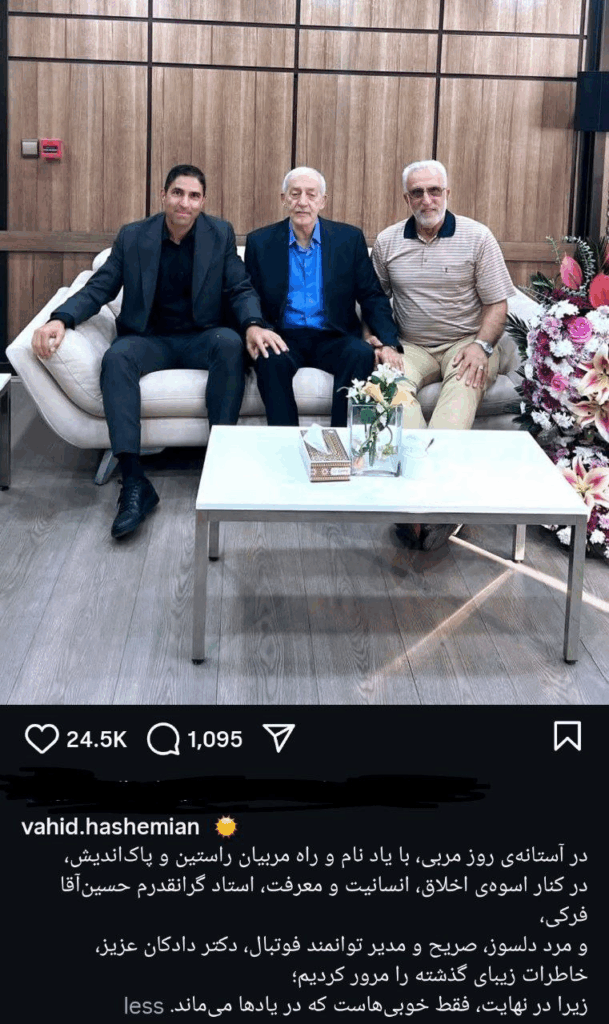 هاشمیان در توضیح این پست نوشته است: «در آستانهی روز مربی، با یاد نام و راه مربیان راستین و پاکاندیش، در کنار اسوهی اخلاق، انسانیت و معرفت، استاد گرانقدرم حسین آقا فرکی و مرد دلسوز و مدیر توانمند فوتبال، دکتر دادکان عزیز، خاطرات زیبای گذشته را مرور کردیم؛ زیرا در نهایت، فقط خوبیهاست که در یادها میماند.»