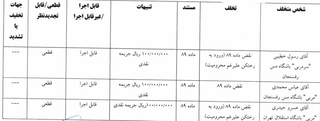 همچنین رسول خطیبی و عباس محمدی هم با جرایمی مواجه شدهاند.