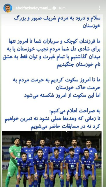 مدیرعامل باشگاه استقلال خوزستان پیشتر وعده داده بود تا روز یکشنبه، یازدهم آبان، بخشی از مطالبات بازیکنان پرداخت شود، اما با عملینشدن این وعده، بازیکنان به نشانه اعتراض، بیانیهای مشترک در صفحات شخصی خود در اینستاگرام منتشر کردند. در این متن، آنها تأکید کردهاند تا زمانی که طلبهایشان پرداخت نشود، نه تمرینی انجام خواهند داد و نه در مسابقات تیم شرکت خواهند کرد.