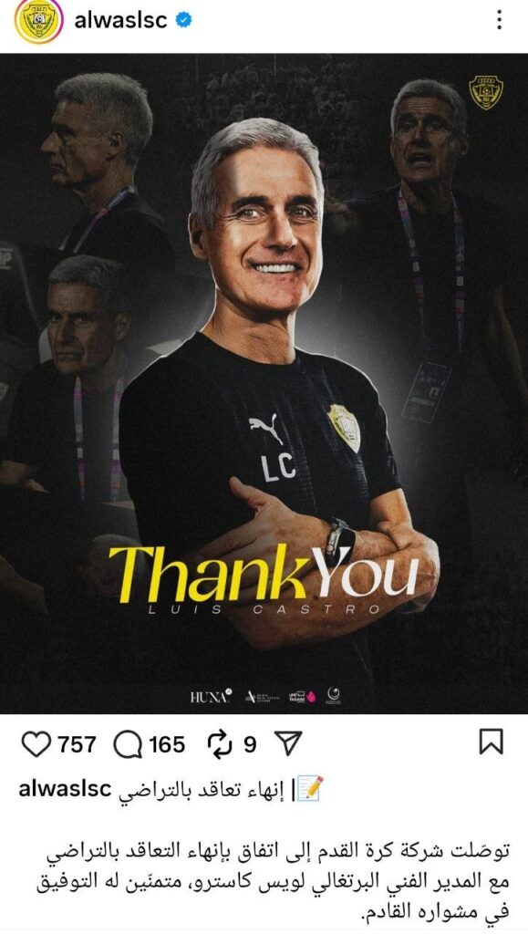 لوئیس کاسترو، سرمربی الوصل امارات از هدایت این تیم برکنار شد.