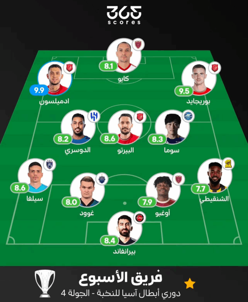 در میان تمام بازیکنان حاضر در ترکیب منتخب، ادمِیلسون جونیور با ثبت یک گل و یک پاس گل بالاترین امتیاز را به دست آورد و با نمره ۹.۹ عنوان بهترین بازیکن هفته چهارم لیگ نخبگان آسیا را از آن خود کرد.