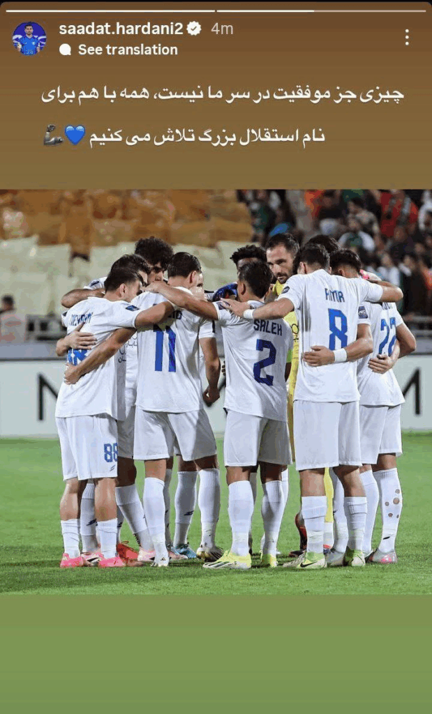 به گزارش هفت ورزشی، صالح حردانی، مدافع و کاپیتان تیم فوتبال استقلال تهران، ساعاتی پس از تساوی آبیپوشان برابر الوحدات اردن در رقابتهای آسیایی، با انتشار استوری در صفحه شخصی خود، از روحیه جنگندگی و اتحاد درون تیم سخن گفت.