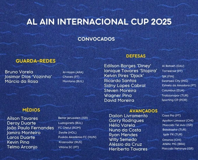 به گزارش هفت ورزشی، تیم ملی کیپ ورد فهرست بازیکنان دعوت شده خود برای شرکت در تورنمنت چهارجانبه العین امارات را اعلام کرد.