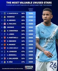 در صدر این فهرست، خویچا کواراتسخلیا، ستاره پاری سن ژرمن با ارزش ۹۰ میلیون یورو قرار دارد که تنها ۴۶٪ از دقایق لیگ را بازی کرده است. پس از او، رودریگو از رئال مادرید با ۲۴٪ حضور و ارزش ۸۰ میلیون یورو دیده میشود. نونو مندس، مدافع پاریسنژرمن نیز با ۴۵٪ حضور و ارزش ۷۵ میلیون یورو در جایگاه سوم قرار دارد.
