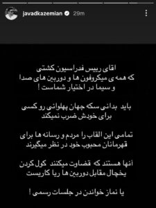 در واکنش به این اظهارات، جواد کاظمیان، بازیکن سابق تیم ملی فوتبال و پرسپولیس، با انتشار یک استوری در صفحه شخصی خود، به شدت از این نوع برخورد انتقاد کرد. او در متن خود نوشت: «آقای رییس فدراسیون کشتی که همهی میکروفونها و دوربینهای صدا و سیما در اختیار شماست! باید بدانی سکه جهانپهلوانی را کسی برای خودش ضرب نمیکند. تمامی این القاب را مردم و رسانهها برای قهرمانان محبوب خود در نظر میگیرند. آنها هستند که قضاوت میکنند کول کردن یخچال مقابل دوربینها ریاکاریست یا نماز خواندن در جلسات رسمی!»