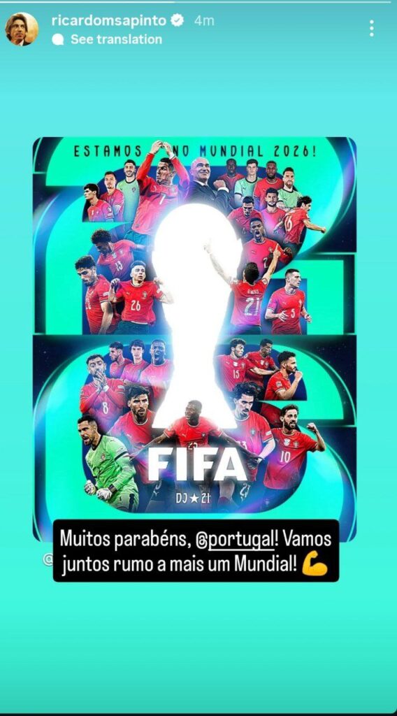 به گزارش هفت ورزشی، ریکاردو ساپینتو، سرمربی پرتغالی استقلال، پس از قطعی شدن صعود تیم ملی پرتغال به جام جهانی واکنش نشان داد. ساپینتو در پیامی کوتاه که در صفحه شخصی خود منتشر کرد، نوشت: