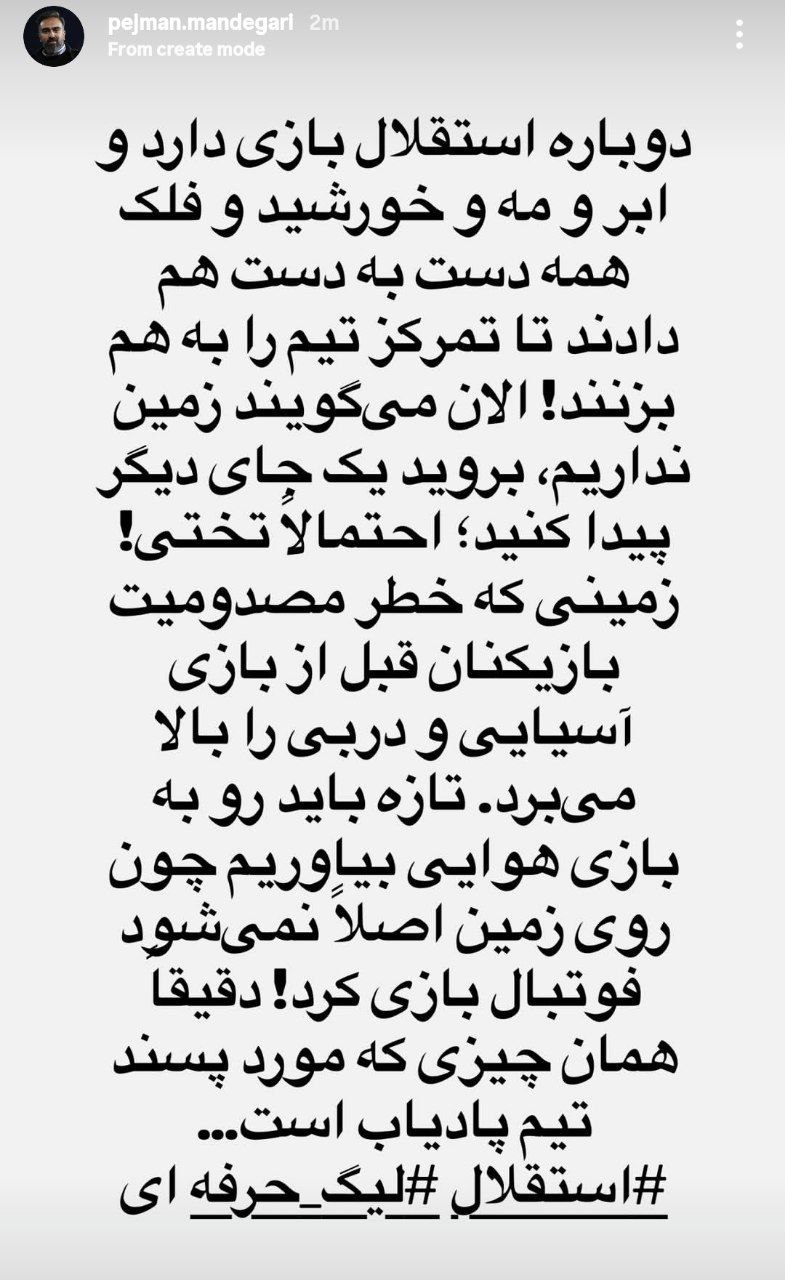 پژمان ماندگاری، مدیر رسانهای استقلال، با انتشار استوری به شایعات درباره مشکلات محل برگزاری دیدار مقابل پادیاب واکنش نشان داد و شرایط را مداخلهآمیز و حواسپرتکن توصیف کرد.