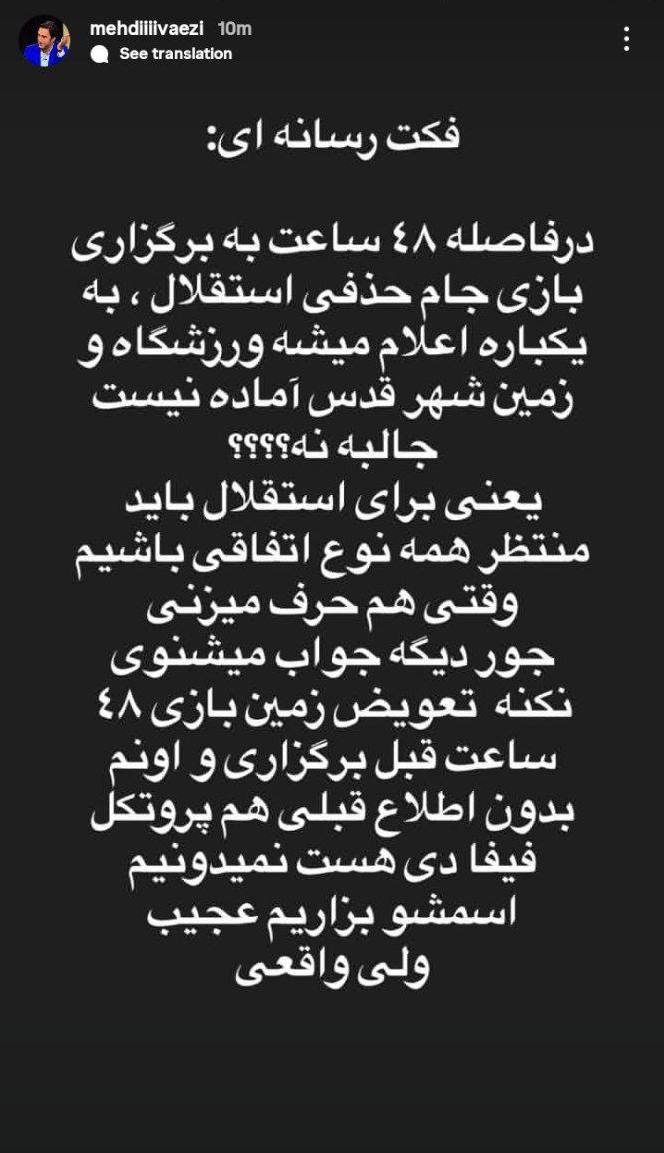 مهدی واعظی، مسئول رسانهای استقلال، با انتشار استوری نسبت به اعلام ناگهانی تغییر ورزشگاه دیدار جام حذفی این تیم واکنش نشان داد و آن را تصمیمی عجیب در آستانه مسابقه توصیف کرد.