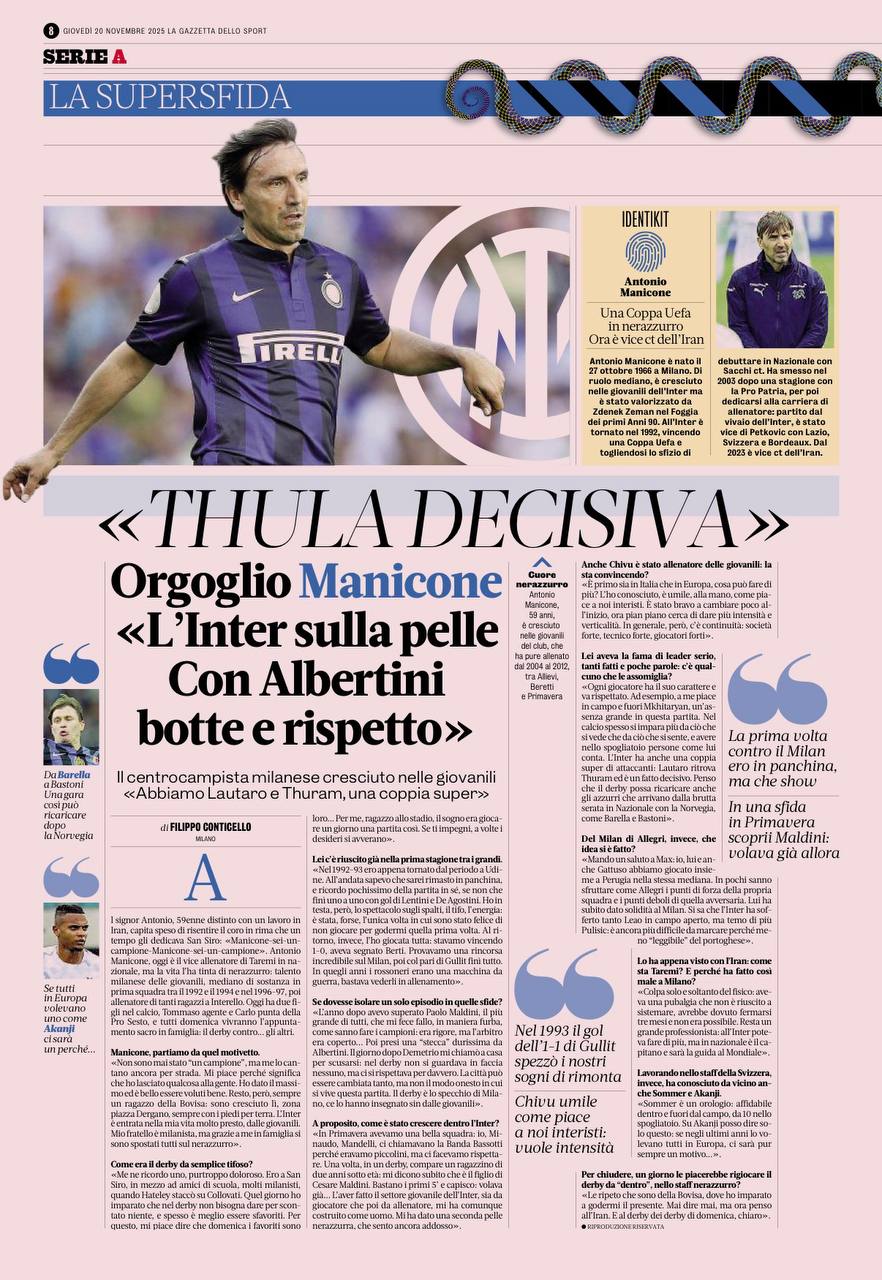 آنتونیو مانیکونه امروز دستیار سرمربی مهدی طارمی در تیم ملی ایران است، اما مسیر زندگیاش را با رنگهای نراتزوری نقاشی کرده: استعدادی میلانزاده در تیمهای پایه، هافبکی پرتلاش در تیم بزرگسالان میان سالهای ۱۹۹۲ تا ۱۹۹۴ و فصل ۹۷-۱۹۹۶، و بعدها مربی بسیاری از نوجوانان در مرکز تمرینی اینتر.