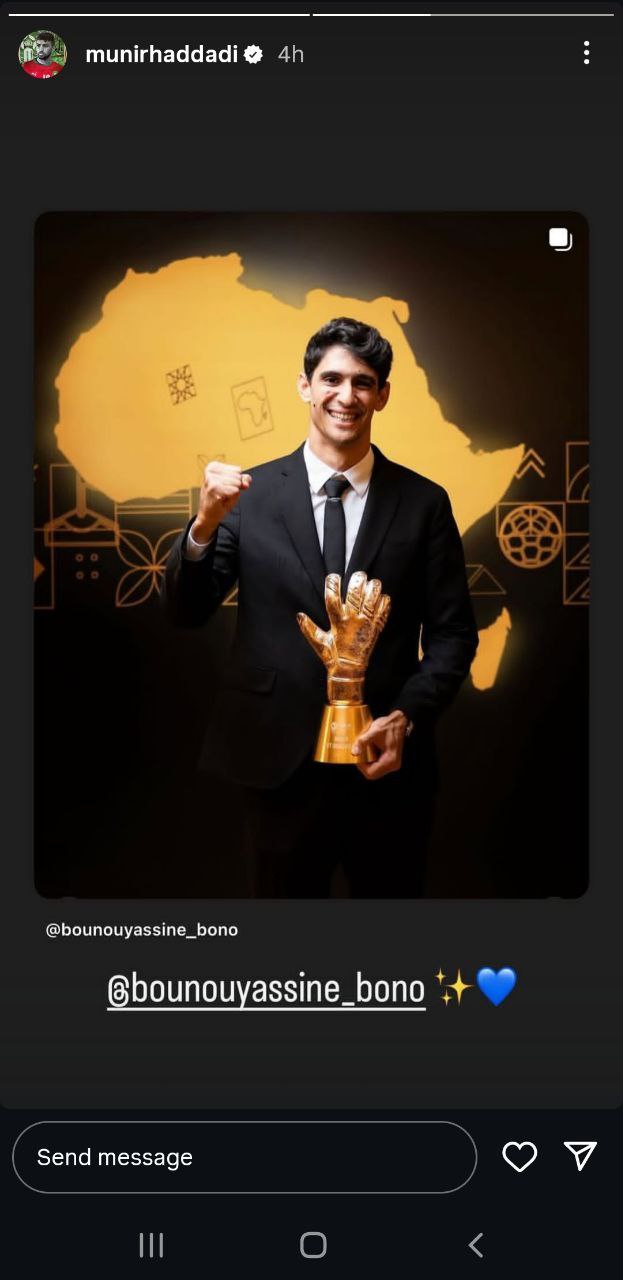 منیر الحدادی با انتشار پیامهایی در شبکههای اجتماعی، موفقیت همتیمیهایش در تیم ملی مراکش را در مراسم سالانه فوتبال آفریقا تبریک گفت.