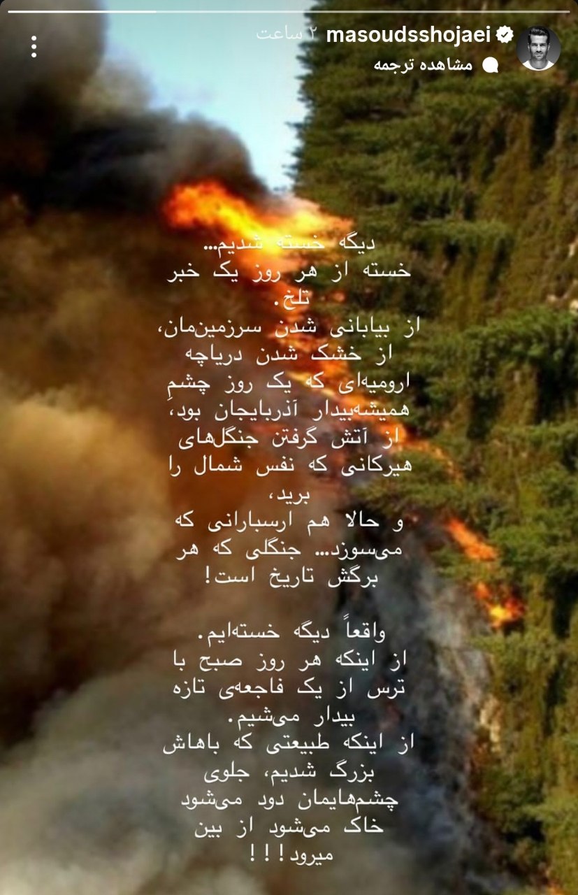 به گزارش هفت ورزشی، مسعود شجاعی، کاپیتان سابق تیم ملی فوتبال ایران، با انتشار استوری در صفحه شخصی خود به آتشسوزیهای اخیر جنگلهای هیرکانی واکنش تند و احساسی نشان داد.