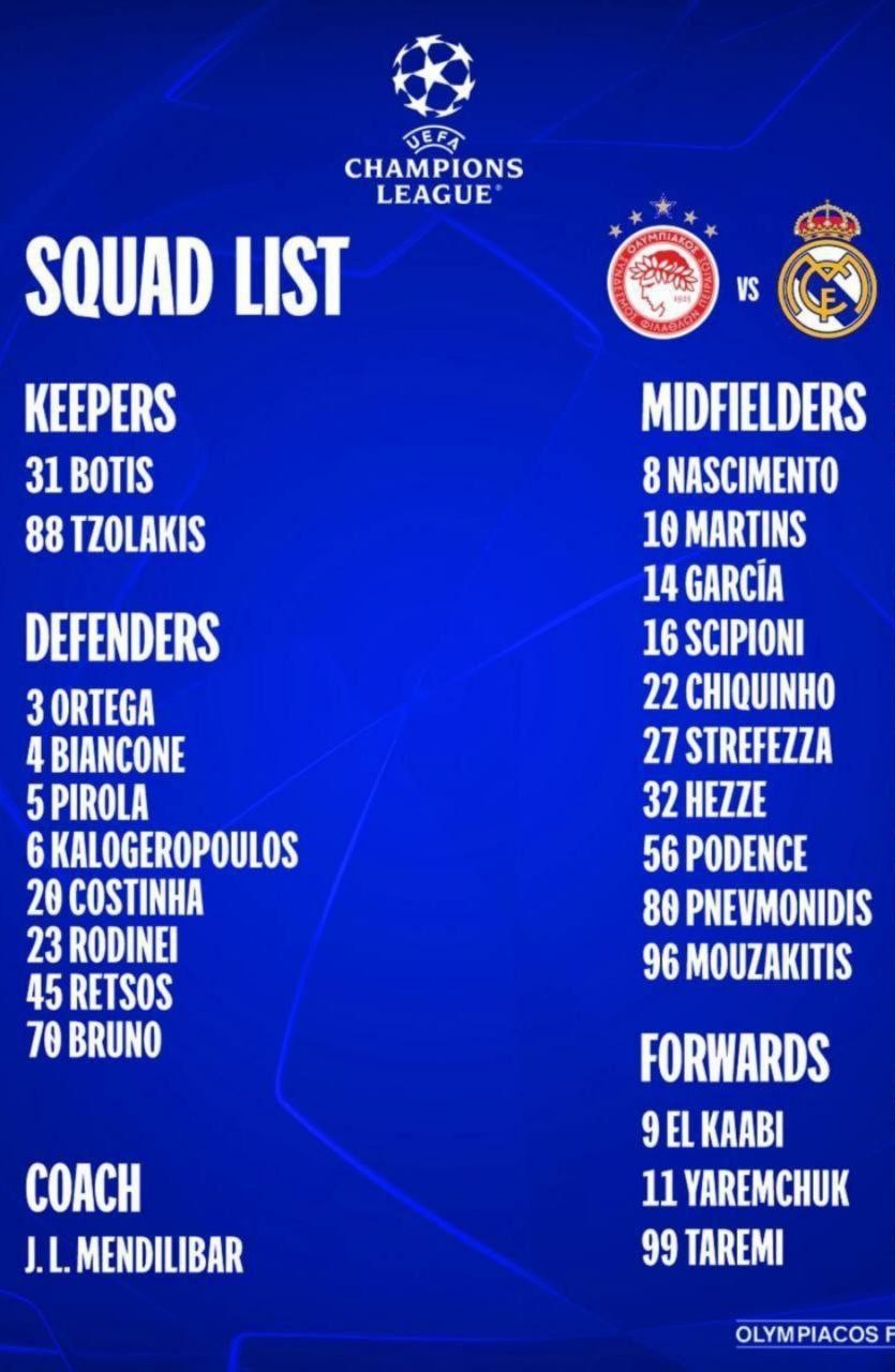 به گزارش هفت ورزشی، باشگاه المپیاکوس لیست بازیکنان خود برای دیدار امشب برابر رئال مادرید در لیگ قهرمانان اروپا را اعلام کرد و مهدی طارمی، مهاجم ایرانی تیم، در این فهرست حضور دارد.