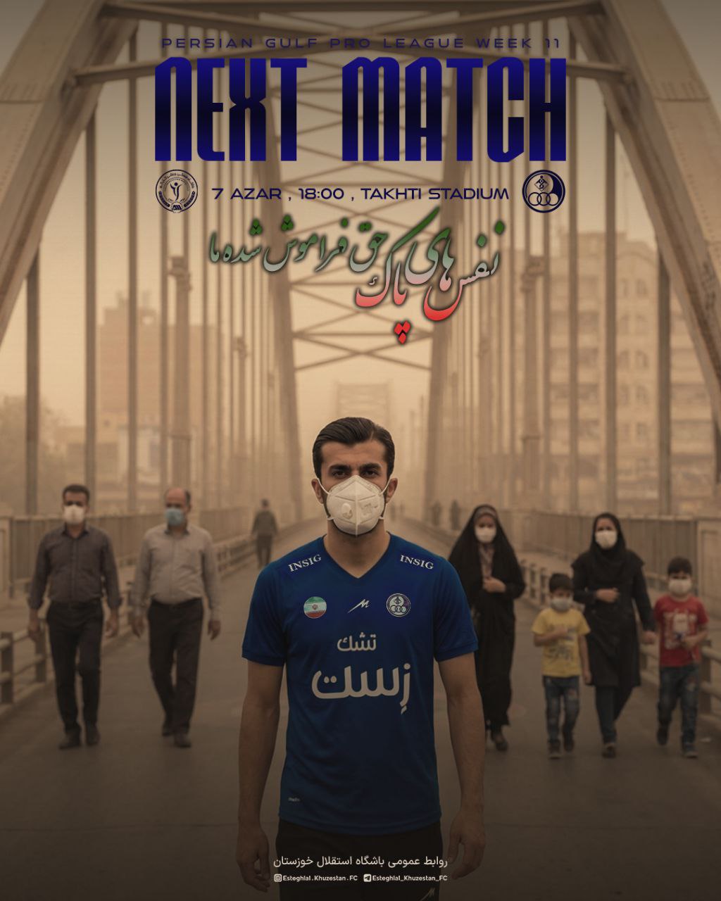 به گزارش هفت ورزشی، باشگاه استقلال خوزستان در آستانه مسابقه فردای این تیم برابر گلگهر، پوستر رسمی بازی را با طرحی کنایهآمیز درباره وضعیت آلودگی هوا منتشر کرد.