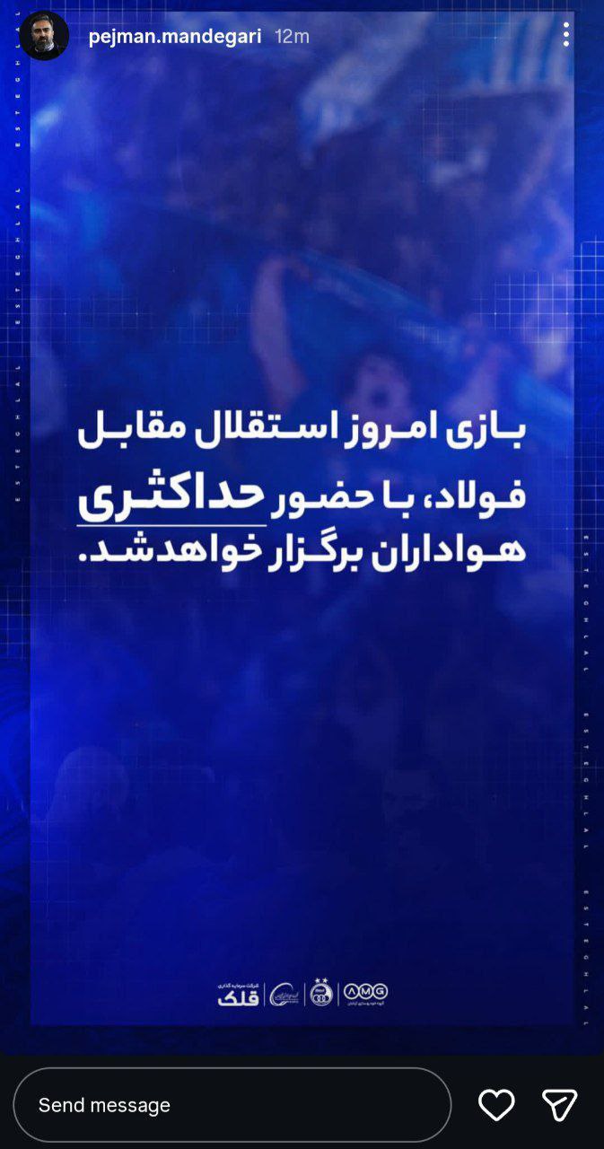 ماندگاری در این پیام اعلام کرد: «بازی امروز استقلال مقابل فولاد با حضور حداکثری هواداران برگزار خواهد شد.»
