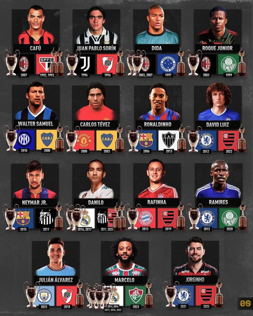 در میان این چهرهها نام چند ستاره بزرگ نیز دیده میشود؛ از رونالدینیو، برنده توپ طلای ۲۰۰۵، تا نیمار، مارسلو و کافو. حالا با قهرمانی اخیر فلامینگو، جورجینیو تازهترین عضو این گروه کمیاب محسوب میشود.