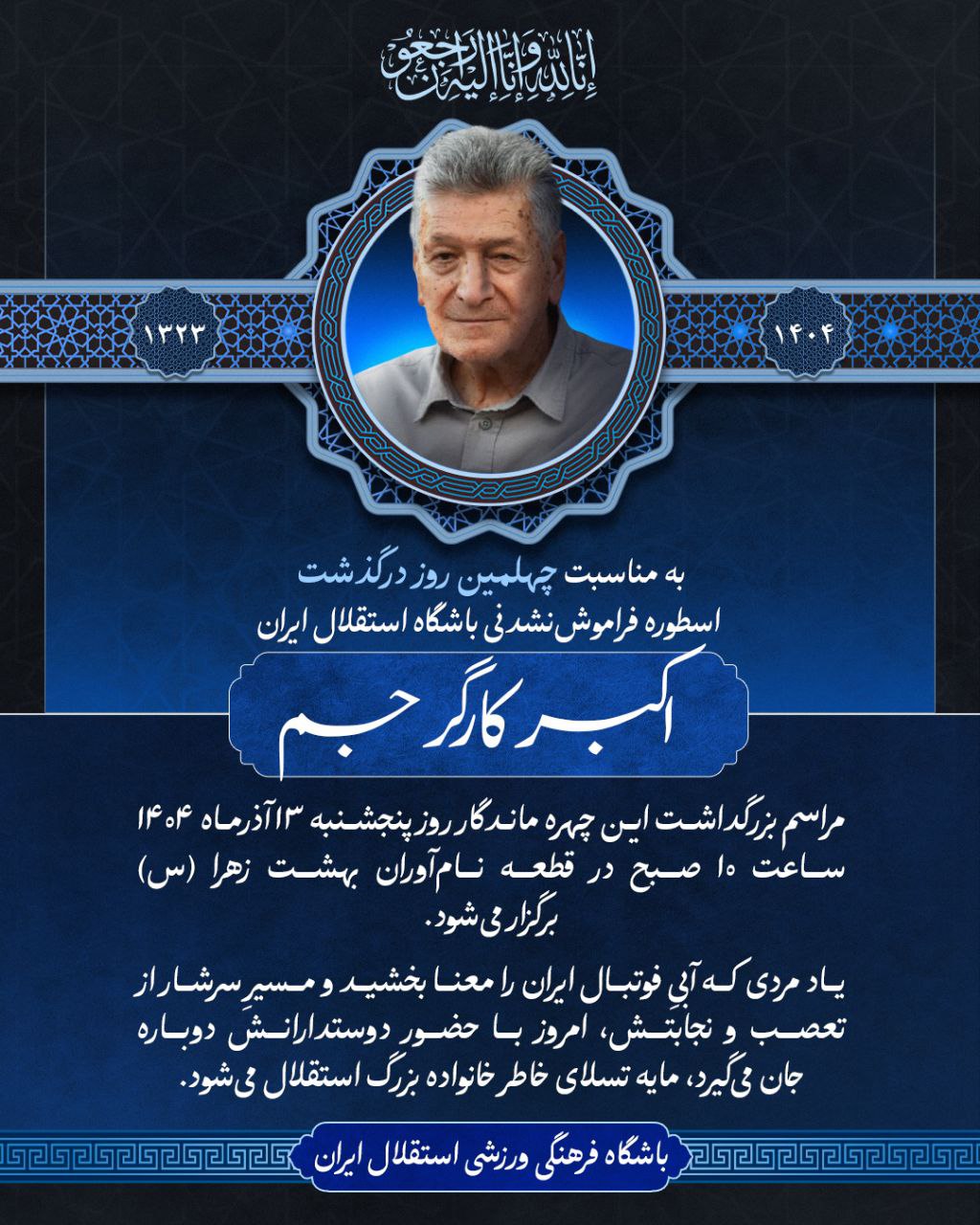 به مناسبت چهلمین روز درگذشت اسطوره فراموشنشدنی باشگاه استقلال ایران؛ اکبر کارگرجم مراسم بزرگداشت این چهره ماندگار روز پنجشنبه ۱۳ آذرماه ۱۴۰۴ ساعت ۱۰ صبح در قطعه نامآوران بهشت زهرا (س) برگزار میشود.