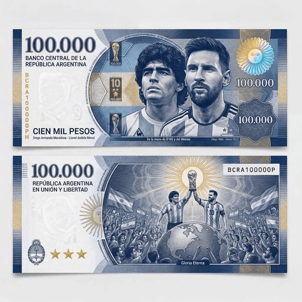 به گزارش هفت ورزشی، بانک مرکزی آرژانتین روز پنجشنبه اطلاع داد که قصد دارد پیش از برگزاری جام جهانی ۲۰۲۶، اسکناس یادبودی با ارزش ۱۰۰ هزار پزو منتشر کند؛ اسکناسی که برای گرامیداشت دو چهره برجسته فوتبال این کشور، دیگو مارادونا و لیونل مسی طراحی شده است.