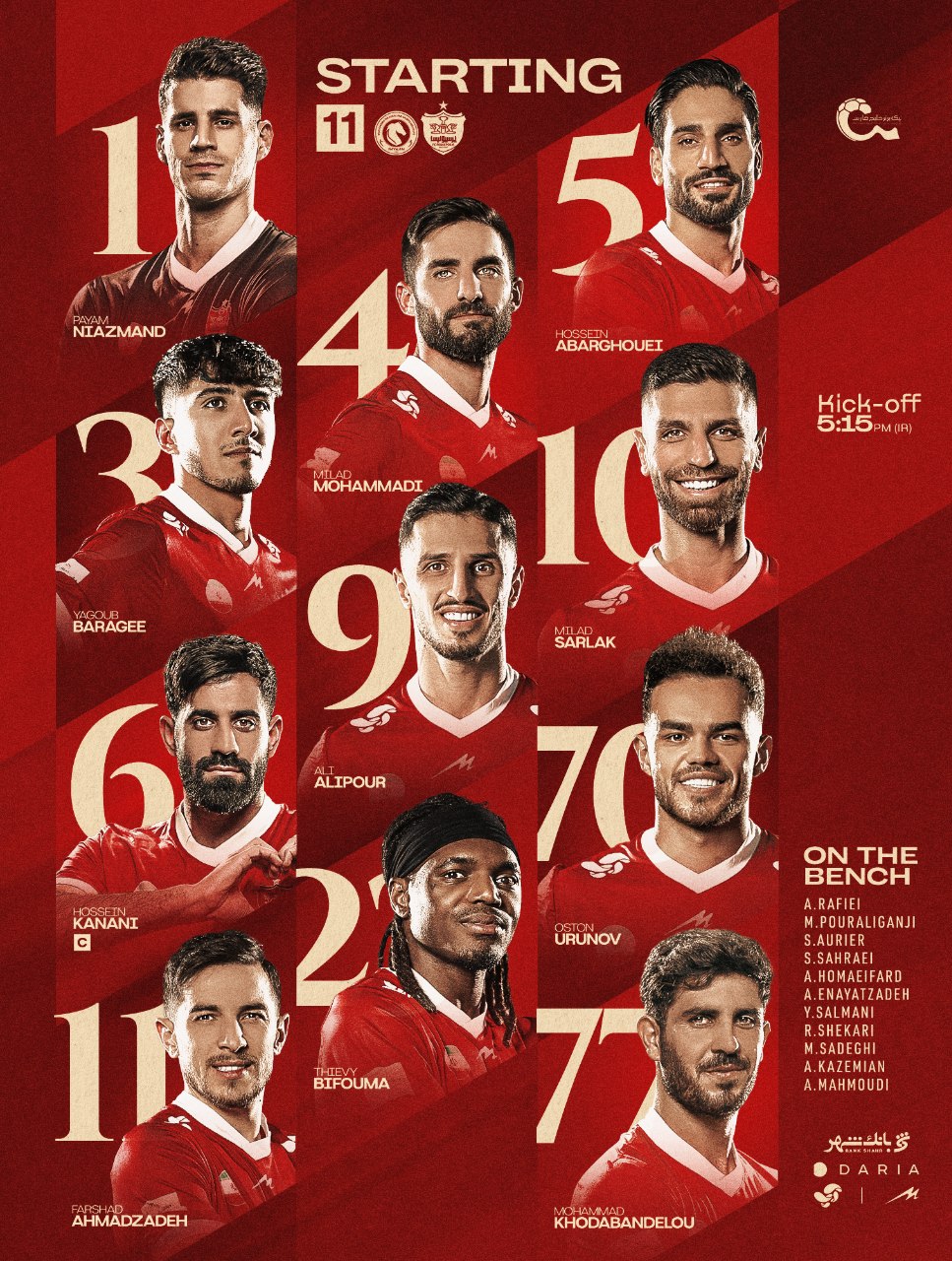 پیام نیازمند، یعقوب براجعه، حسین ابرقویی، محمدحسین کنعانی زادگان، میلاد محمدی، میلاد سرلک، محمد خدابنده لو، فرشاد احمدزاده، اوستون اورونوف، تیوی بیفوما و علی علیپور بازیکنانی هستند که اوسمار برای این دیدار به میدان فرستاده است.