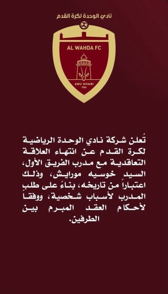 شرکت باشگاه ورزشی فوتبال الوحده اعلام میکند که قرارداد همکاری با سرمربی تیم فوتبال بزرگسالان، ژوزه مورایس، از تاریخ امروز به پایان رسیده است. این تصمیم بنا به درخواست خودِ سرمربی و به دلایل شخصی اتخاذ شده و مطابق با مفاد قرارداد منعقدشده میان دو طرف صورت گرفته است.