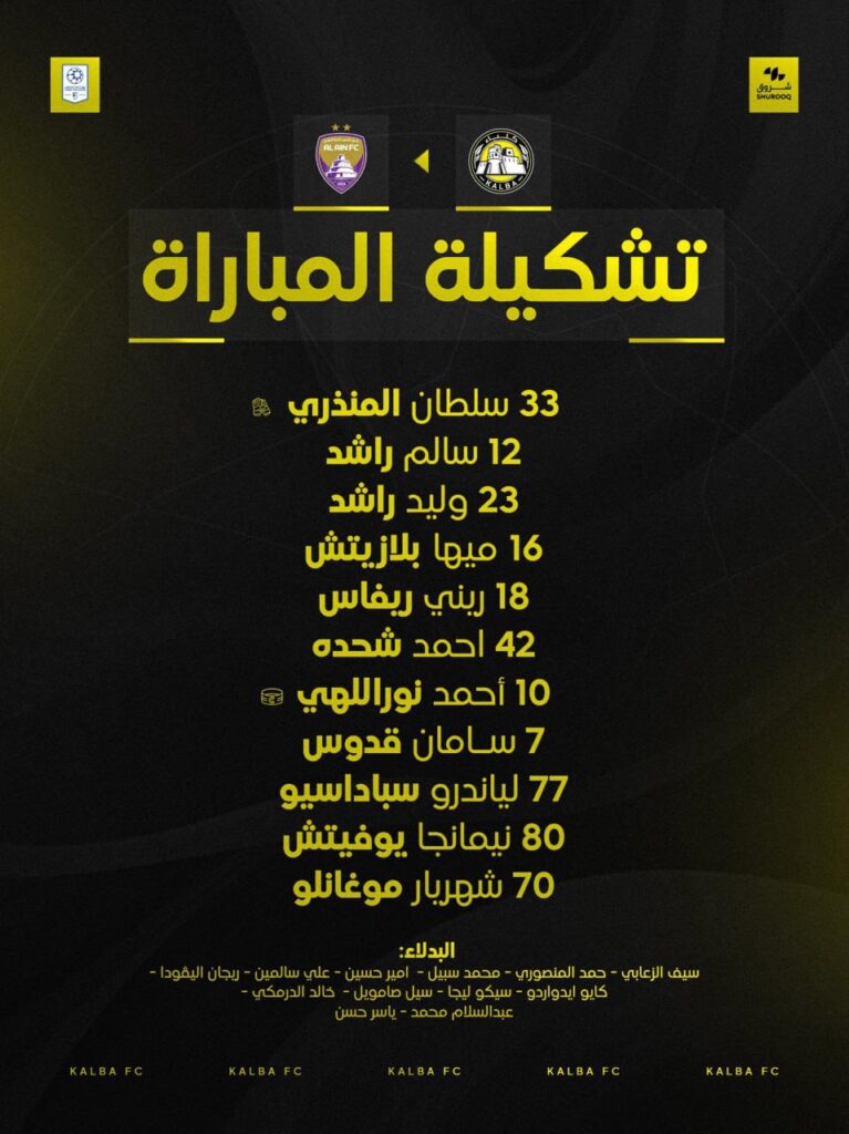 کلباء در این دیدار سه بازیکن ایرانی خود را در ترکیب اصلی میبیند. احمد نوراللهی، کاپیتان این تیم که در تمامی مسابقات فصل جاری لیگ و جام بانک اسلامی ابوظبی به میدان رفته، بار دیگر در جمع ۱۱ نفر اصلی حضور دارد. سامان قدوس نیز که تاکنون هشت بازی در لیگ انجام داده و آمار یک گل و یک پاس گل را ثبت کرده، در خط میانی برابر العین بازی خواهد کرد.