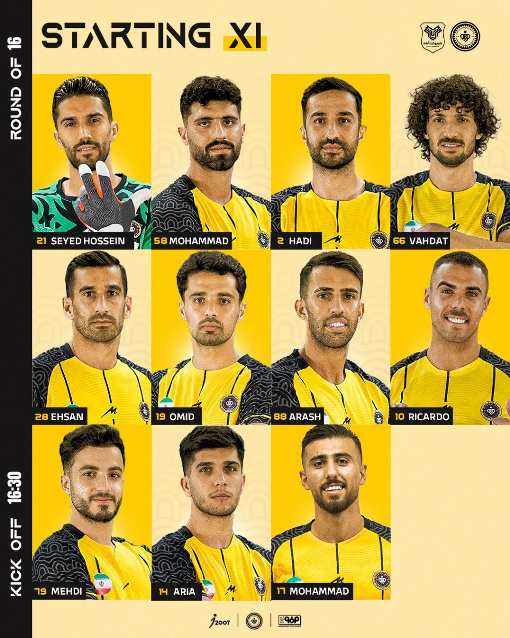 سیدحسین حسینی، محمد دانشگر، هادی محمدی، آریا یوسفی، احسان حاجصفی، امید نورافکن، وحدت هنانوف، ریکاردو آلوز، مهدی لطفی، آرش رضاوند و محمد عسکری یازده بازیکن طلایی پوشان برای این دیدار هستند.