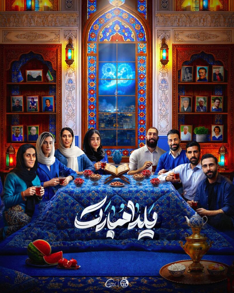اما پرسپولیس تنها نیست. دقایقی بعد از انتشار این پوستر، باشگاه استقلال نیز طرح یلدایی خودش را منتشر کرد. ماجرا نه تنها بهتر نبود بلکه حتی در ایده هم ضعیف تر به نظر می رسید. در این پوستر باشگاه استقلال کاپیتان‌های تیم‌های مردان و زنانش در رشته‌های مختلف فوتبال، فوتسال، هندبال و …. دور کرسی نشانده با این تفاوت که یلدای استقلالی‌ها برخلاف رسمی که تمام مردم ایران دارند نه قرمز که آبی است. استقلالی‌ها که یک تجربه عجیب در استفاده از هوش مصنوعی در پوستر برای مراسم هشتادسالگی باشگاه داشتند، این بار با کمک از هوش مصنوعی آنرا منتشر کرده‌اند.