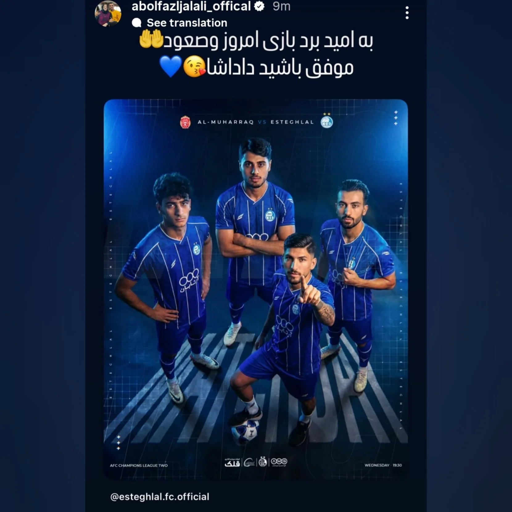 به گزارش هفت ورزشی، ابوالفضل جلالی مدافع تیم فوتبال استقلال که از سوی ریکاردو ساپینتو کنار گذاشته شده، در آستانه دیدار این تیم مقابل المحرق بحرین با انتشار استوری برای هم بازی های خود آرزوی موفقیت کرد.