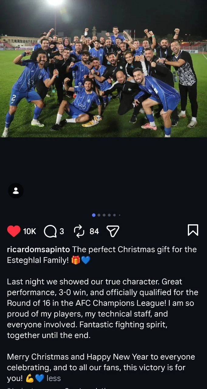 سرمربی پرتغالی استقلال پس از برتری قاطع ۳ بر صفر مقابل رقیب آسیایی و قطعی شدن صعود به مرحله یکهشتم نهایی، با انتشار پیامی احساسی، این موفقیت را هدیه کریسمس به هواداران دانست و از روحیه جنگندگی شاگردانش تمجید کرد.