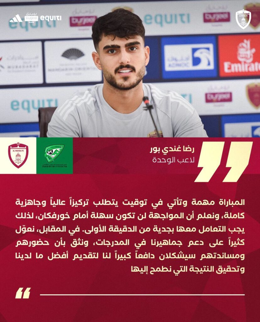 مهاجم ایرانی الوحده در نشست خبری پیش از این مسابقه گفت: «این بازی در مقطع حساسی برگزار میشود و برای ما اهمیت زیادی دارد. به همین دلیل نیازمند تمرکز بالا و آمادگی کامل هستیم. میدانیم دیدار مقابل خورفکان آسان نخواهد بود و اگر بخواهیم به نتیجه برسیم، باید از دقیقه اول بازی را جدی بگیریم و با قدرت و برنامه وارد زمین شویم.»
