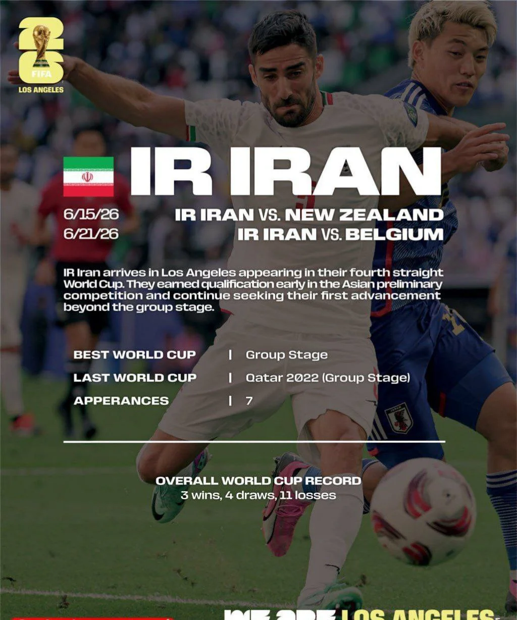 فیفا در توضیح این پوستر، ضمن اشاره به قدرت تیم ملی ایران، آورده است: «ایران در حالی به لسآنجلس میرسد که چهارمین جام جهانی متوالی خود را تجربه میکند. آنها در مسابقات مقدماتی جام جهانی خیلی زود به این مسابقات راه یافتند و همچنان به دنبال اولین صعود از گروه هستند.»