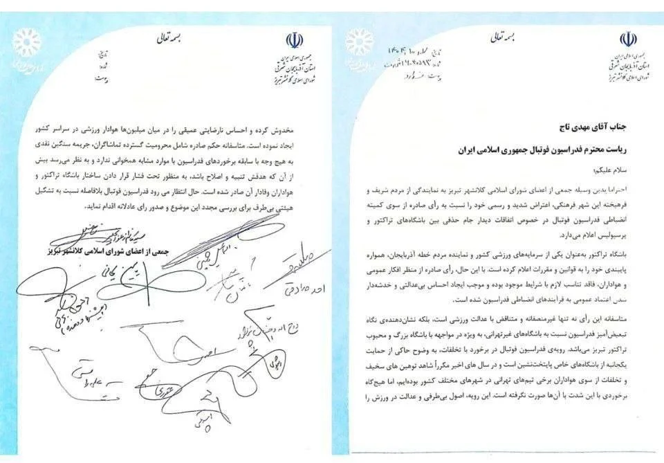 اعضای شورای شهر تبریز در نامهای به فدراسیون فوتبال نسبت به حکم کمیته انضباطی درخصوص بازی تراکتور و پرسپولیس اعتراض کردند!
