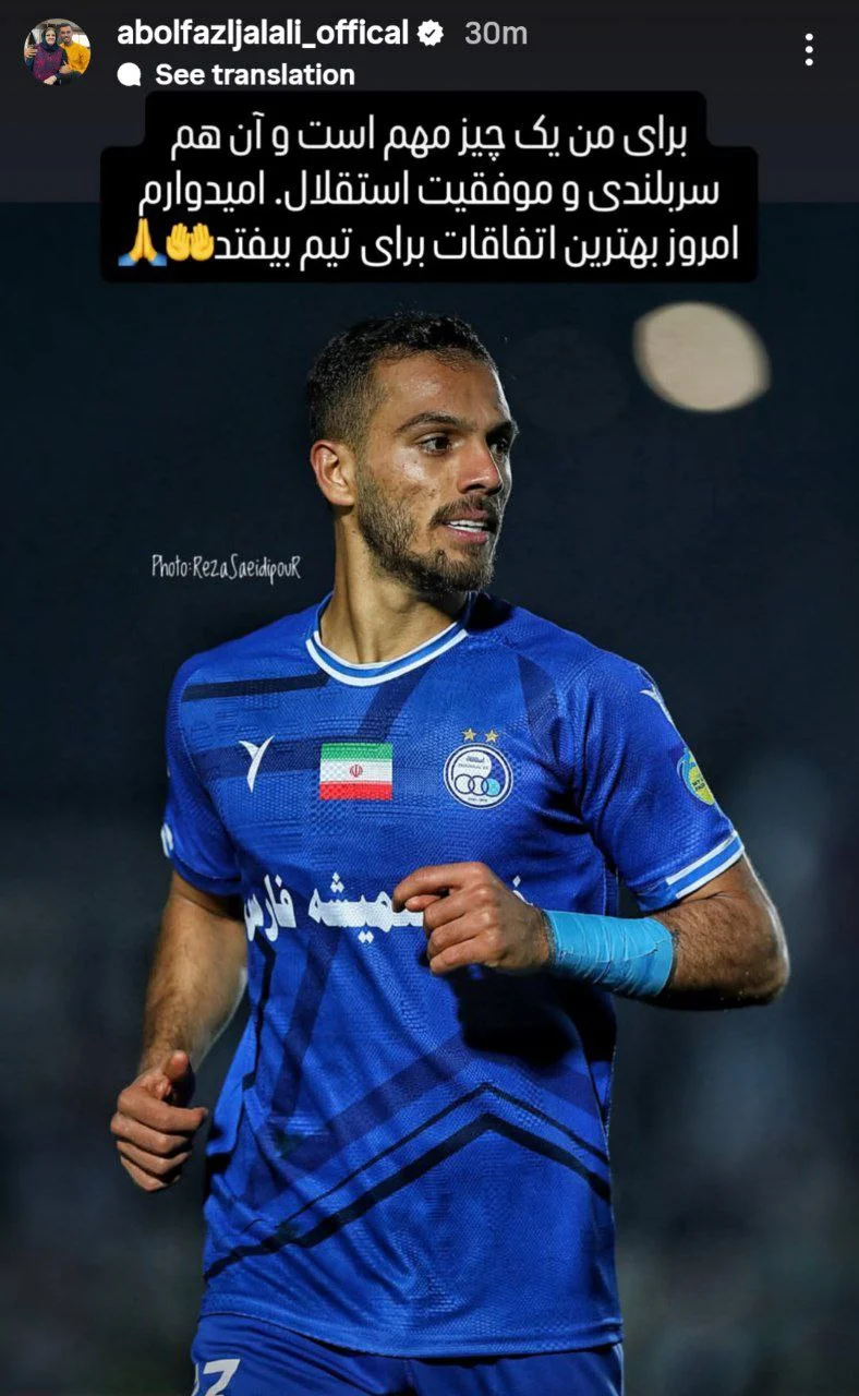 جلالی در این استوری نوشت: برای من یک چیز مهم است و آن هم سربلندی و موفقیت استقلال. امیدوارم امروز بهترین اتفاقات برای تیم بیفتد.