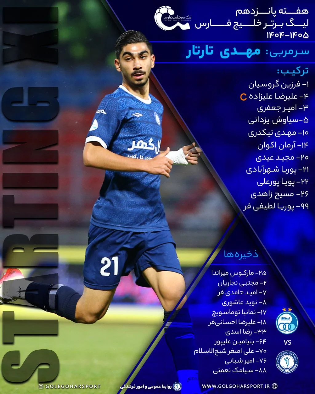 فرزین گروسیان، امیر جعفری، علیرضا علیزاده، سیاوش یزدانی، مهدی تیکدری، آرمان اکوان، مجید عیدی، پوریا شهرآبادی، پویا پورعلی، مسیح زاهدی و پوریا لطفیفر یازده بازیکن مهدی تارتار در این دیدار خواهند بود.