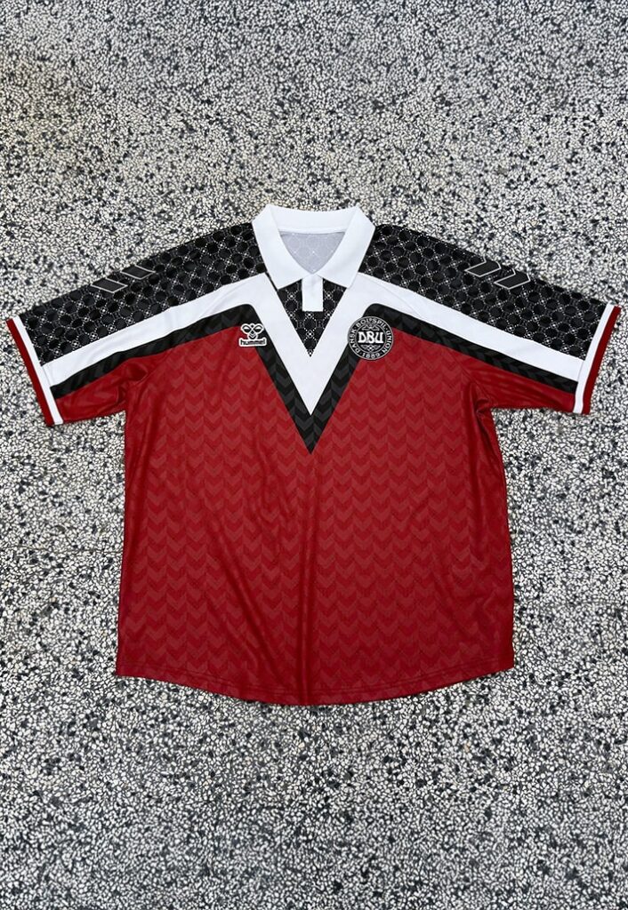 مثالی از توازن بین سنت و نوآوری در طراحی پیراهن خانگی. رنگهای معمولی باشگاه – آبی تیره و قرمز – حفظ شده و خطوط مورب ریز، بافت غنی ایجاد کردهاند. افزودن کمی طلایی، جلوهای فوقالعاده به پیراهن بخشیده است.