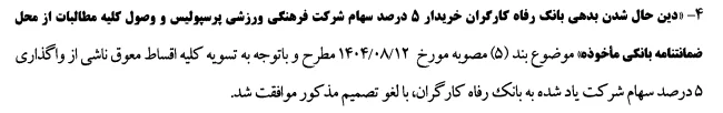 طبق آن مصوبه، قرار بود کل مطالبات از محل «ضبط ضمانتنامههای بانکی» وصول شود. با این حال، طبق صورتجلسه جدید، بانک رفاه کارگران اقدام به تسویه «کلیه اقساط معوق» ناشی از واگذاری ۵ درصد سهام شرکت فرهنگی ورزشی پرسپولیس کرده است.