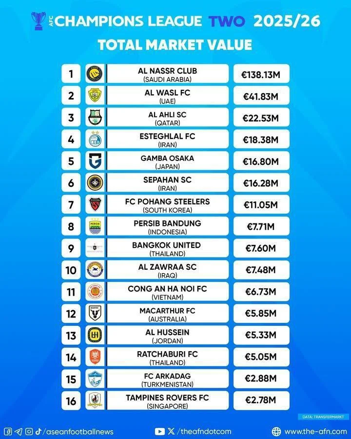 به گزارش هفت ورزشی، با نزدیک شدن به رقابتهای مرحله حذفی لیگ قهرمانان آسیا ۲ در فصل ۲۰۲۵/۲۶، لیست ارزشمندترین تیمهای حاضر در این تورنمنت بر اساس دادههای معتبر منتشر شد.