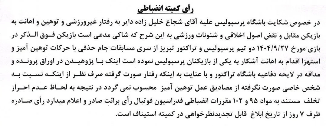 رأی دعوی باشگاه پرسپولیس به طرفیت شجاع خلیلزاده به شرح زیر است: