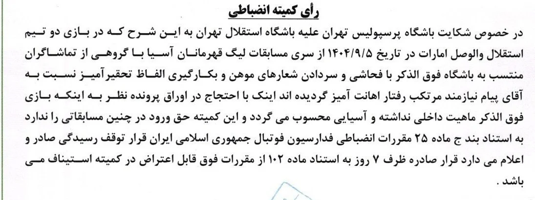 رأی دعوی باشگاه پرسپولیس به طرفیت باشگاه استقلال به شرح زیر است:
