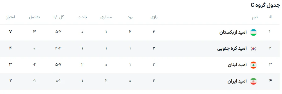 از این گروه ازبکستان و کره جنوبی صعود کردند و خجالت آور این است که لبنان با پنج گل زده و 3 امتیاز بالاتر از ما قرار گرفت که هیچ گلی نزدیم و تنها دو امتیاز به دست آوردیم.