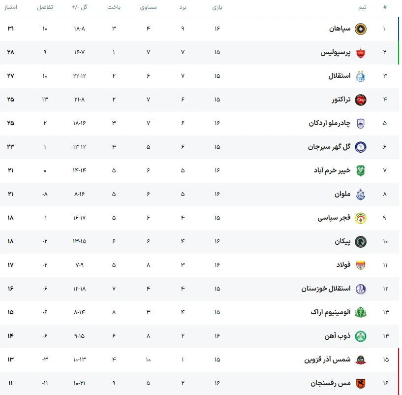 جدول لیگ برتر ایران پس از پایان روز دوم هفته شانزدهم.