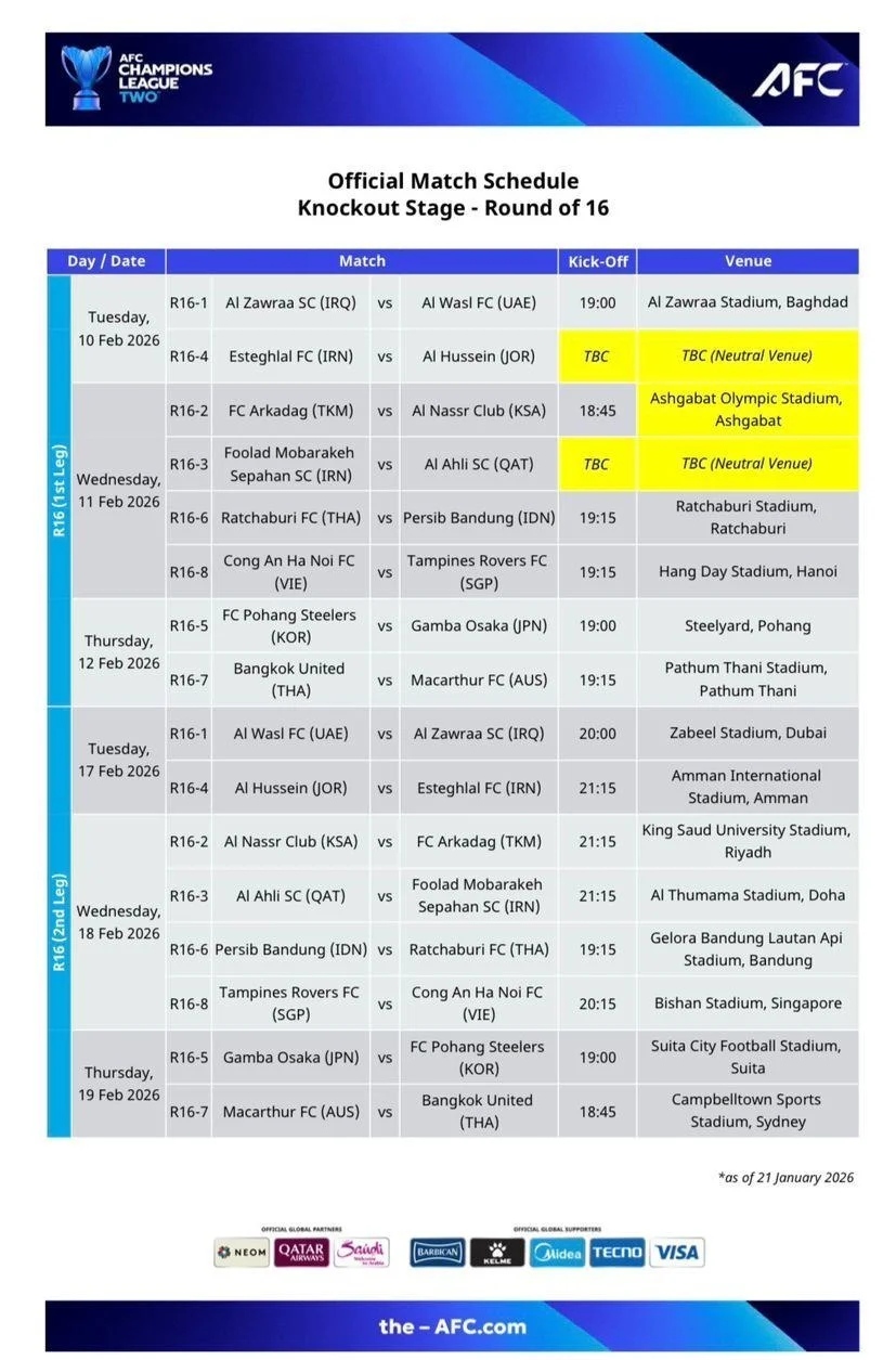 به گزارش هفت ورزشی، کنفدراسیون فوتبال آسیا (AFC) برنامه دیدارهای مرحله یکهشتم نهایی لیگ قهرمانان آسیا 2 را ویرایش کرد.