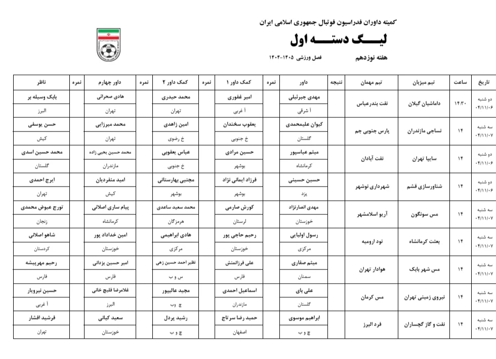 داوران بازیهای هفته نوزدهم لیگ دسته اول در فصل ۱۴۰۵-۱۴۰۴ مشخص شدند که به شرح زیر است: